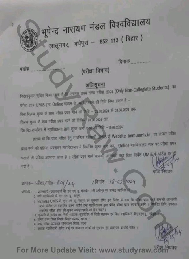 BNMU Part-1 Exam Form Apply Last Date | 2nd June 2024 |