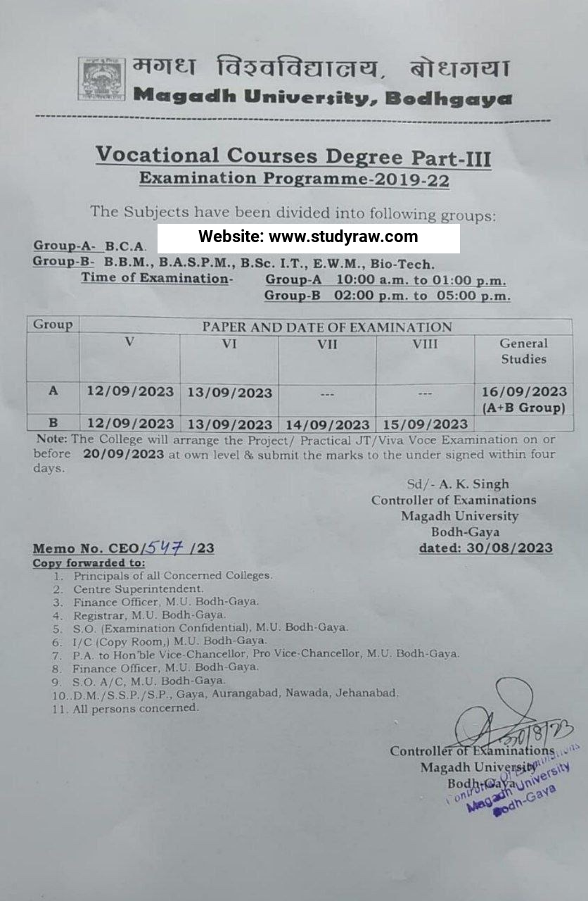 Magadh University Vocational Part-3 Exam Schedule 2023 / BCA, B.B.M., B.A.S.P.M., B.Sc. I.T., E.W.M., Bio-Tech. / Session 2019-22 Update: Magadh University is recently declared the…View More